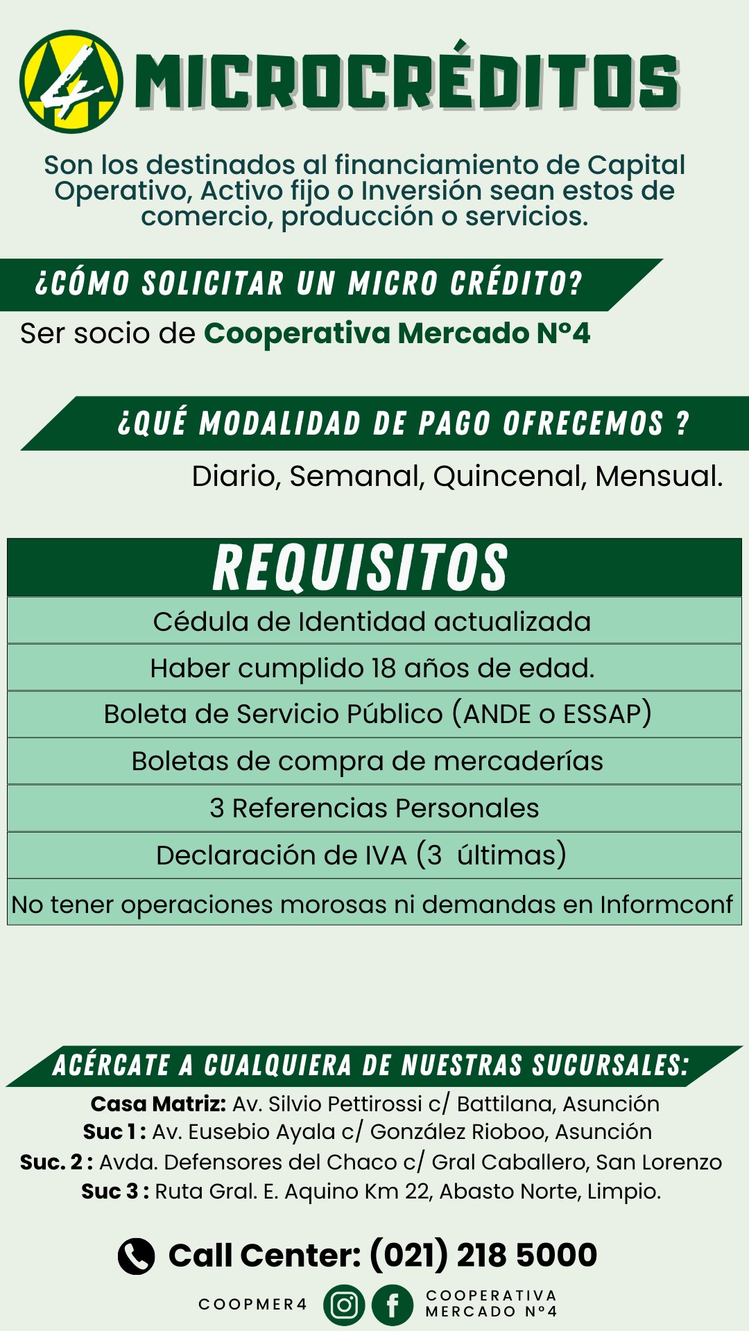 Los socios de la cooperativa Mercado N°4, tienen la posibilidad de acceder a créditos para capital operativo, considerando la envergadura de la empresa, con el asesoramiento requerido, a nivel financiero y/o operativo de un asesor capacitado permanentemente, con la tecnología de las microfinanzas.